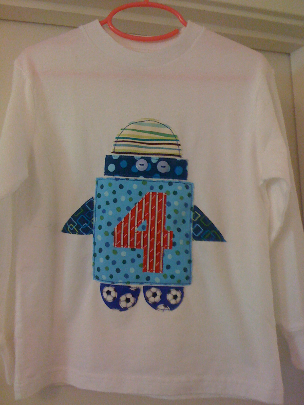 This is a robot shirt with the number 4. $28. This one has already been sold, but you if want something similar, email me. If you would like to personalize this shirt with an initial on the front and the number on the back $32. Contact me: kirshaq(at)gmail(dot)com