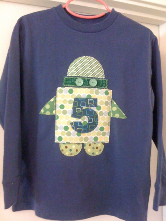 For the 5 year old robot lover, this will make their birthday day a fun one. This one has already been sold, but you if want something similar, email me. If you would like to personalize this shirt with an initial on the front and the number on the back $32. Contact me: kirshaq(at)gmail(dot)com