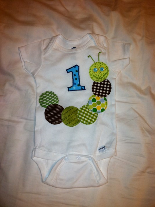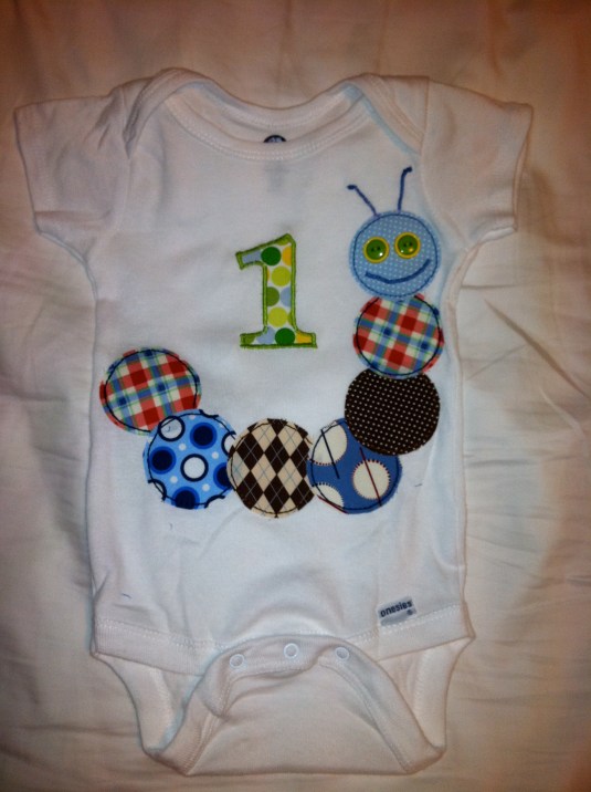I just love making these caterpillar shirts and I especially love Β seeing them on one year olds. π I like how this particular caterpillar has a smirky little smile. Interested in one for your one year old? Email me kirshaq(at)gmail(dot)com.